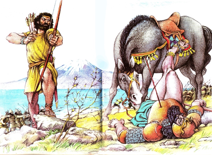 Հայկը թիկնեղ ու ազատասեր հայ դյութազուն էր։Նա չուզեց ենթարկվել Ասորեստանի բռնակալ Բելին ։ Բելը որոշում է ուժով հնազանդեցնել նրան և մեծ զորքով մտնում է Արարադի երկիր: Հայկը իր քաջազուն թոռների ու որդիների հետ ընդառաջ է գնում Բելի զորաբանակին և Վանա լճի ափին մարտի բռնվում: Ճակատամարտից առաջ Հայկը դիմում է իր զորքին. Հայկը կանգնում է բլուրի վրա և երեքթևյան նետով մահացու խոցում է գոռոզ Բելին, նա անշնչացած տապալվում է գետնին։ Բելի բանակը խուճապահար փախչում է։Ի պատիվ հաղթանակի Հայկը շինում է դաստակերտ՝ անունը դնում Հայք։